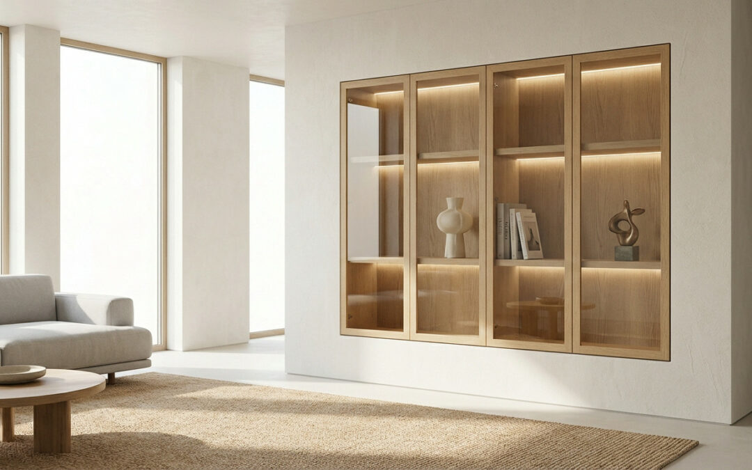 Un fond éclairé repousse les limites visuelles du meuble. La vitrine ne s’impose plus comme un bloc sombre, mais comme une ouverture lumineuse qui aère la pièce.